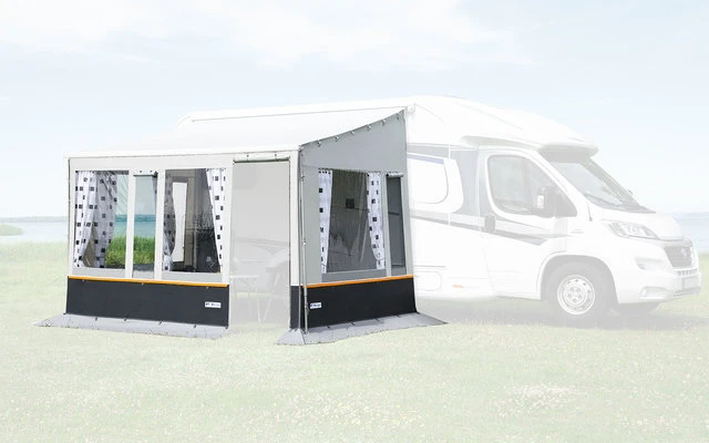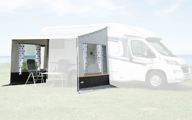 Die Vorderwand für das Markisenzelt ist für eine Markisenbreite 300 und 400 cm ausgelegt. Für die übrigen Breiten kann die Vorderwand durch das Verbreiterungselement passend erweitert werden. Passend für die Markisen Thule Serie 5 und Fiamma F45.