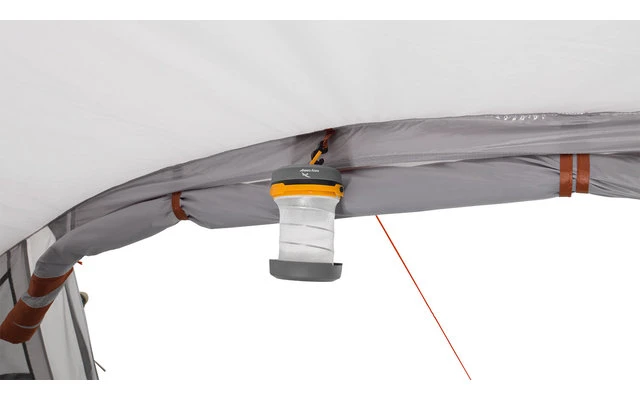 Im Innenzelt des Easy Camp Huntsville 500 mit Trennvorhang finden 5 Personen Platz. Robuste, vorgeformte Fiberglasstangen sorgen im Wohnraum des Tunnelzelts mit drei Fenstern, Seitentür sowie abgedeckten Lüftungsöffnungen an Vorder- und Rückseite für Stehhöhe. Der aufrollbare Zeltboden im Wohnbereich kann zum Reinigen einfach entfernt werden.