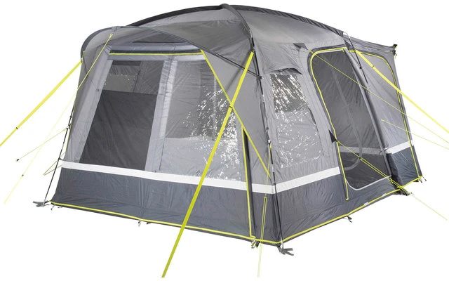 Die Dachkonstruktion und die Seitenwände bieten ein optimales Raumgefühl. Der fest vernähte Boden mit dem Außenzelt verhindert das Eindringen von Schmutz, Nässe, Krabbeltieren und schützt vor Zugluft. Die Bodenwanne ist am Eingang herunterklappbar und verhindert Stolperfallen. Der Eingang kann als Vordach mittels den mitgelieferten Aufstellstangen ausgestellt werden. 2 Gazefenster aus extra starkem, reißfestem 150D „Superfine“ Moskitonetz belüften den Wohnbereich und halten Insekten aus dem Zelt. Die innenliegenden Reißverschluss-Fensterklappen können einfach und variabel je nach Wetterbedingung bedient werden. 2 Klarsichtfolienfenster mit innenliegenden Reißverschluss-Fensterklappen können einfach und variabel bedient werden. 2 Dauerventilationen belüften das Zelt an regnerischen Tagen. Verschließbare, 50/50 teilbare Rückwand. Die gesamte Rückwand passt in die Easy Stow Away Tasche und es entfällt das lästige Aufrollen. Extra robuste Reißverschlüsse mit Regen- Abdeckung gegen Feuchtigkeit. 4 Neon gelbe verstellbare Sturmbänder und Abspannleinen sind in der Dämmerung gut sichtbar. Kabeleingang mittels Reißverschluss und Kabelführung für Beleuchtung.
