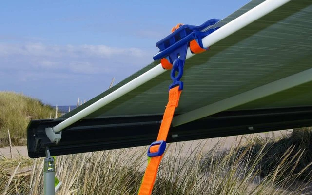 Diese Markisenklemme reduziert das nervige durch den Wind erzeugte „Flappern“ des Markisentuchs fast gänzlich. Einfach die Klemmvorrichtung seitlich auf das Tuch schieben, an den vorhandenen, beidseitig angebrachten Raftern bzw. Federstangen der Markise anlegen, den Hebel andrehen und durch Umlegen verschließen. Die Klemmkissen halten das Tuch es ohne es zu beschädigen. Anschließend werden Silikontape um die Stange gespannt und in die, je nach Stangenumfang, entsprechende Rasterlochung eingehakt. Kompatibel mit dem Tie-Strap für mehr Stabilität mittels Einzug in die vorhandene Kederschiene. Anbringung an fast allen Markisensystemen möglich, egal ob mit runden, ovalen oder eckigen Rafterstangen.